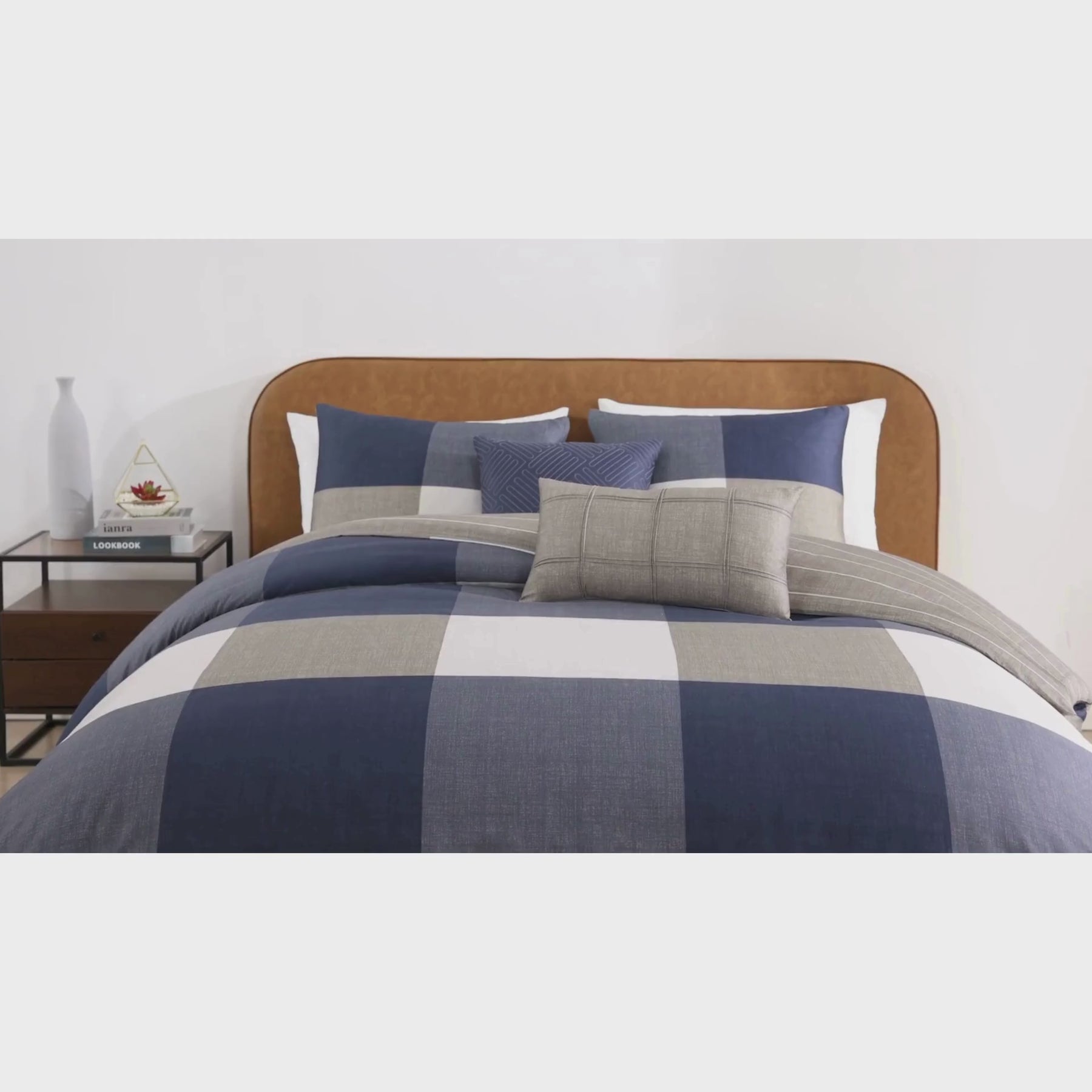 Masculine tones of navy and tan weave in and out of this printed plaid pattern in the Bebejan Checkered Navy Tan 5 piece reversible comforter set. The classic printed pinstripe in fabric-textured tan completes the look on the reverse side. The tan fabric texture continues on the oblong pillow which is accented with pintucks, while the navy square pillow has a contemporary contrast quilting. This 100% cotton sateen 5 piece set includes 2 zipper shams, an 18"x18" quilted pillow, and a 22"x12" printed pillow with pintucks.
