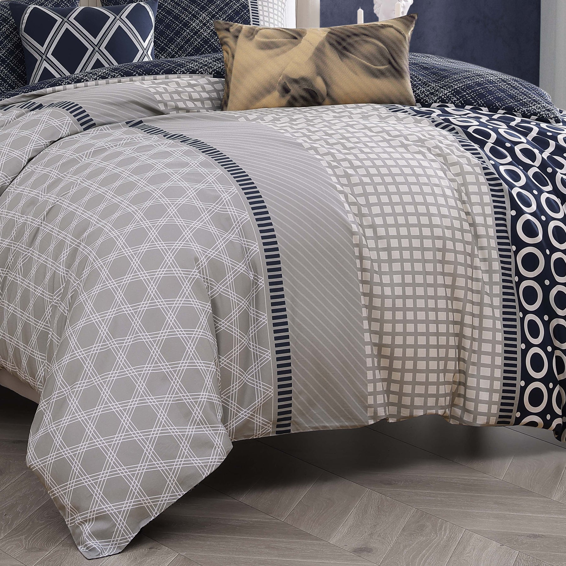 • Comforter Front: Vertical bands of navy blue and tan in geometric patterns