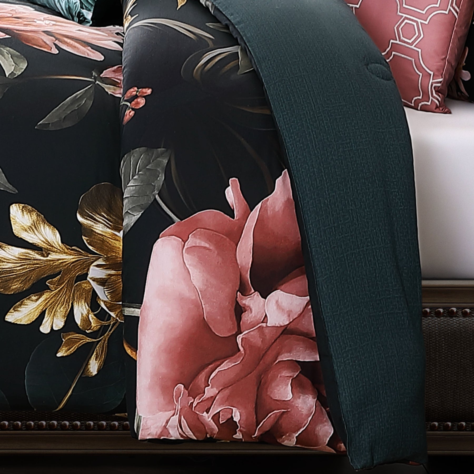 • Comforter Front: Dramatic mauve, peach and metallic gold flowers sit on a black background with colorful birds perched on their stems