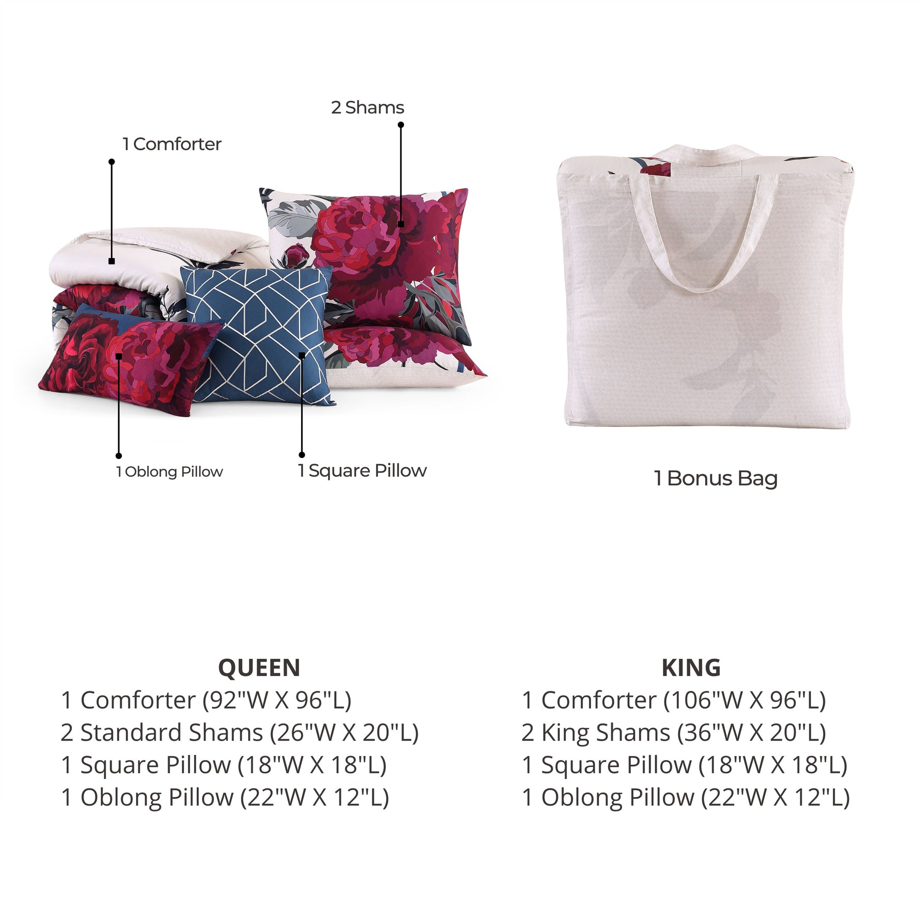 Set Includes: 1 Comforter | 2 Shams | 2 Decorative Pillows | 1 Sustainable Fabric Bonus Bag