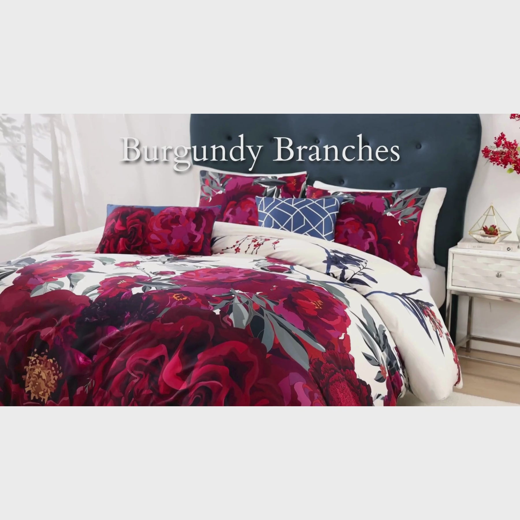 An abundance of full flowers in shades of burgundy, fuchsia and burnt orange from the Bebejan Zinnia 5 Piece Reversible Comforter Set sits below teal and sage vines extending to the top of the bed. The textured reverse print in a sophisticated, warm, off-white brings a second diverse look to your bedroom. The square pillow, with an allover geometric embroidery in white on teal, and the printed oblong pillow, coordinate beautifully with the comforter. This 100% cotton sateen 5 piece set includes 2 zipper shams, an 18"x18" embroidered pillow, and a 22"x12" printed pillow. As a bonus, the set is packaged in a reusable self-fabric tote.