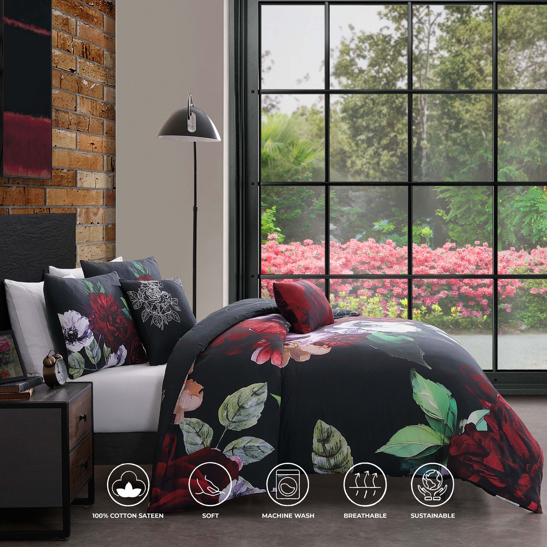 As if from an artist’s dream, the deep red, purple, white and peach flowers with green leaves seem to be painted onto a black canvas in the Bebejan Moody Painting 5 piece reversible comforter set. The reverse, like an initial sketch of a painting, has white outlines of flowers on a black background. A beautiful white on black floral embroidery on a square pillow elevates the comforter set, while the rich red rose print on the oblong pillow is the perfect accent. This 100% cotton sateen 5 piece set includes 2 zipper shams, an 18"x18" embroidered pillow, and a 22"x12" printed pillow. As a bonus, the set is packaged in a reusable self-fabric tote.